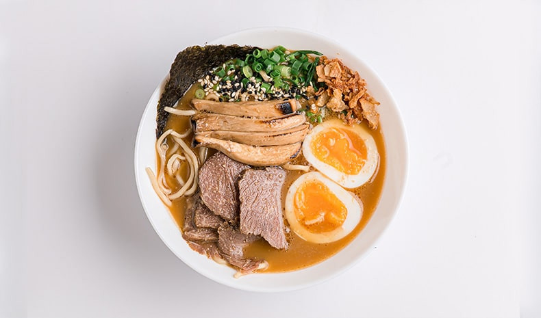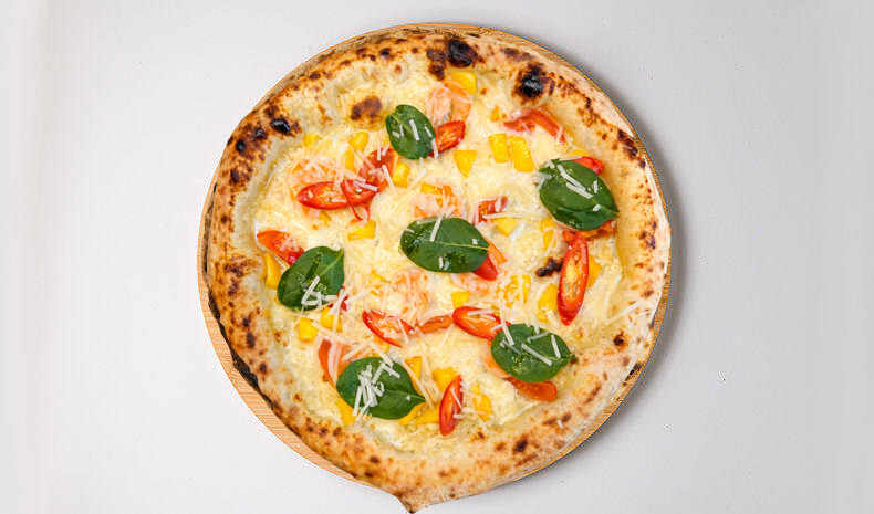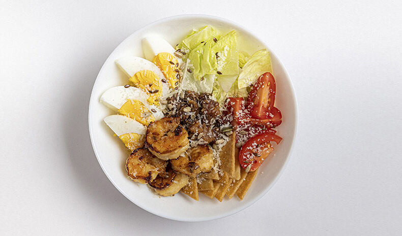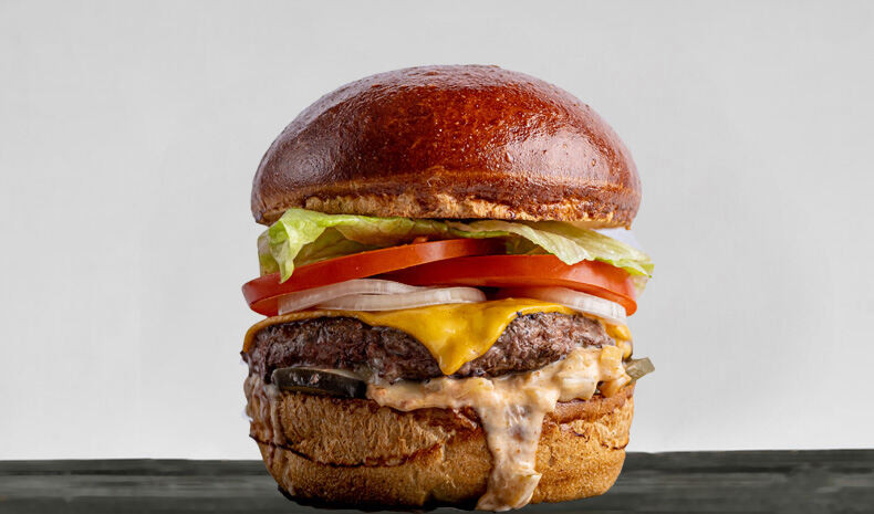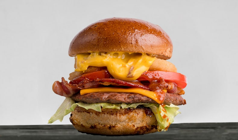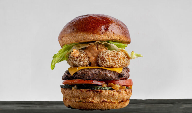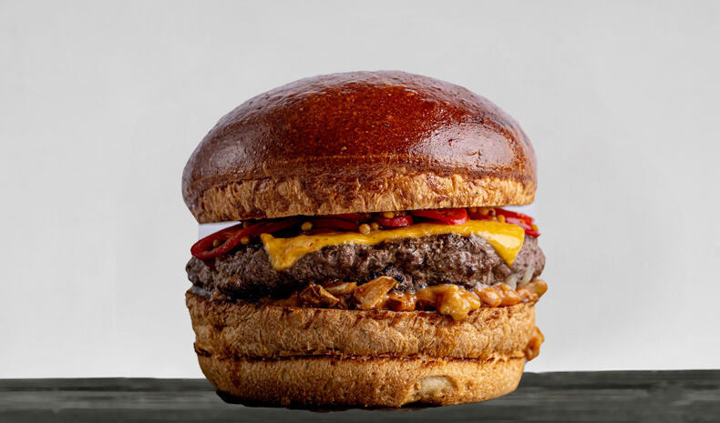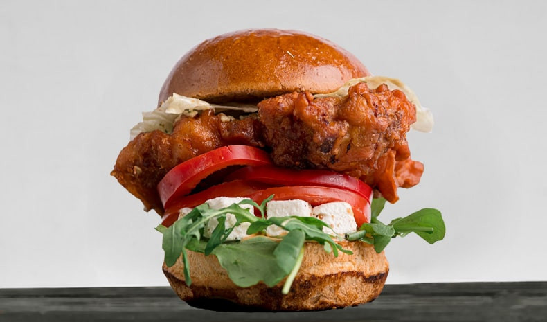 Булочка бриош, котлета говяжья, сыр чедер, креветка тигровая маринованная с соевым соусом и чесноком в панировке панко, томат свежий, лук маринованный на чиз, салат айсберг, соус на основе кисло сладкого соуса, шрирачи, пасты том кха гай, и айоли, огурцы маринованные в кунжутном масле.