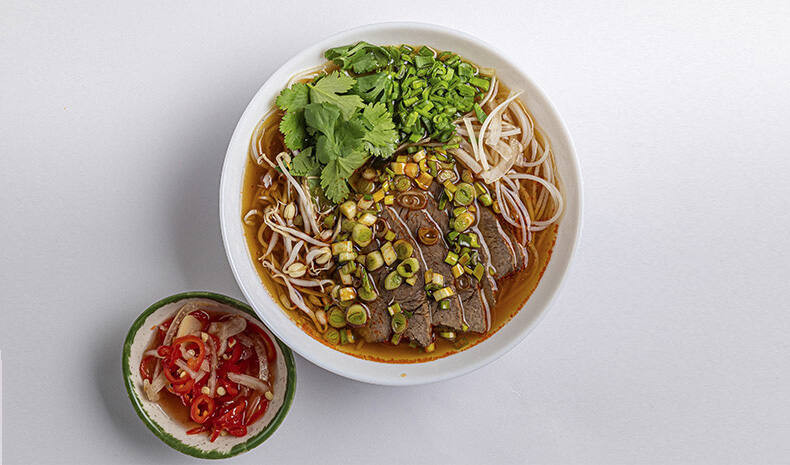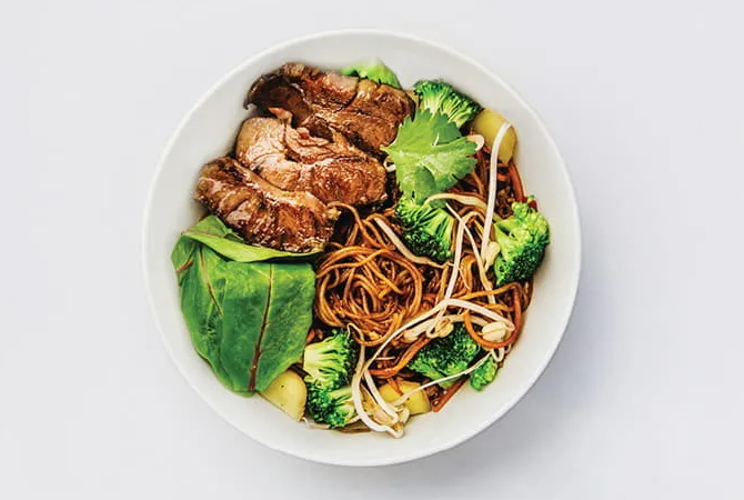Лапша рисовая, яйцо куриное, бедро куриное в панировке, креветка тигровая, лук белый, лук зеленый, морковь, капуста бк, чеснок, ростки сои, томаты черри, фундук, лайм, соус на основе устричного и соевых соусов и меду. Отдельно подается соус из маринованного чили, чеснока и лука и рисового уксуса.