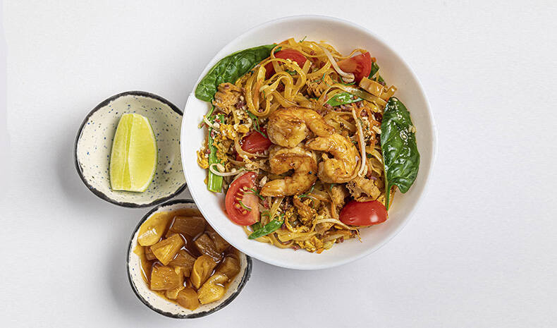 Лапша рисовая широкая, жареное куриное яйцо, креветка тигровая, фучжу маринованная, побеги сои, томаты черри, лук репчатый, лук зеленый, морковь, соус на основе анасового сока, пасты тамаринд, и миксу азийских соусов, чеснок, имбирь, маринованный ананас и имбирь, лайм, арахис жареный, крошка из жареного бекона