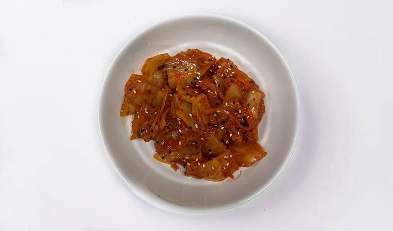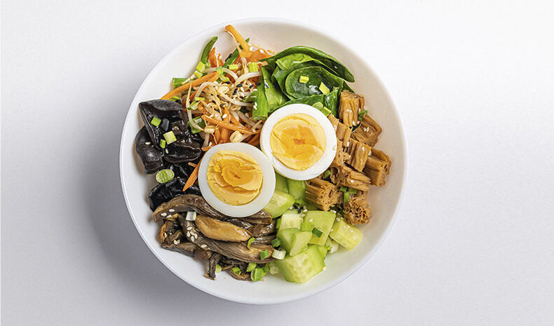Рис жасмин заправленный кунжутным маслом, соевым соусом, рисовым уксусом, фучжу маринованная, гриб древесный черный маринованный, морковь свежая, огурец свежий, лук зеленый, жареный на гриле, яйцо куриное вареное, ростки сои, кунжут микс, соус на основе пасты гочуджан, китайского уксуса и соевого соуса.