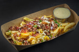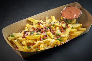 Картопля фрі, з ковбасою та яєчнею, сир моцарелла, бочковий огірок, зелень, зелена цибуля та марс, соус на ваш вибір
